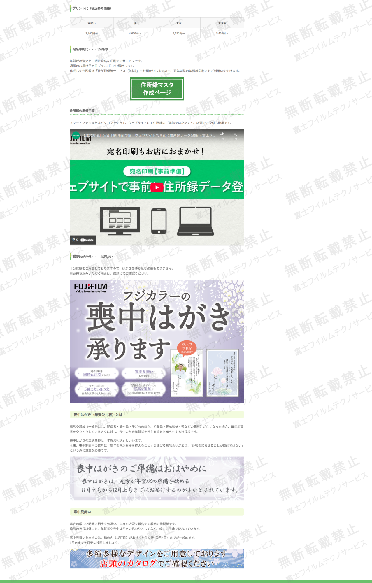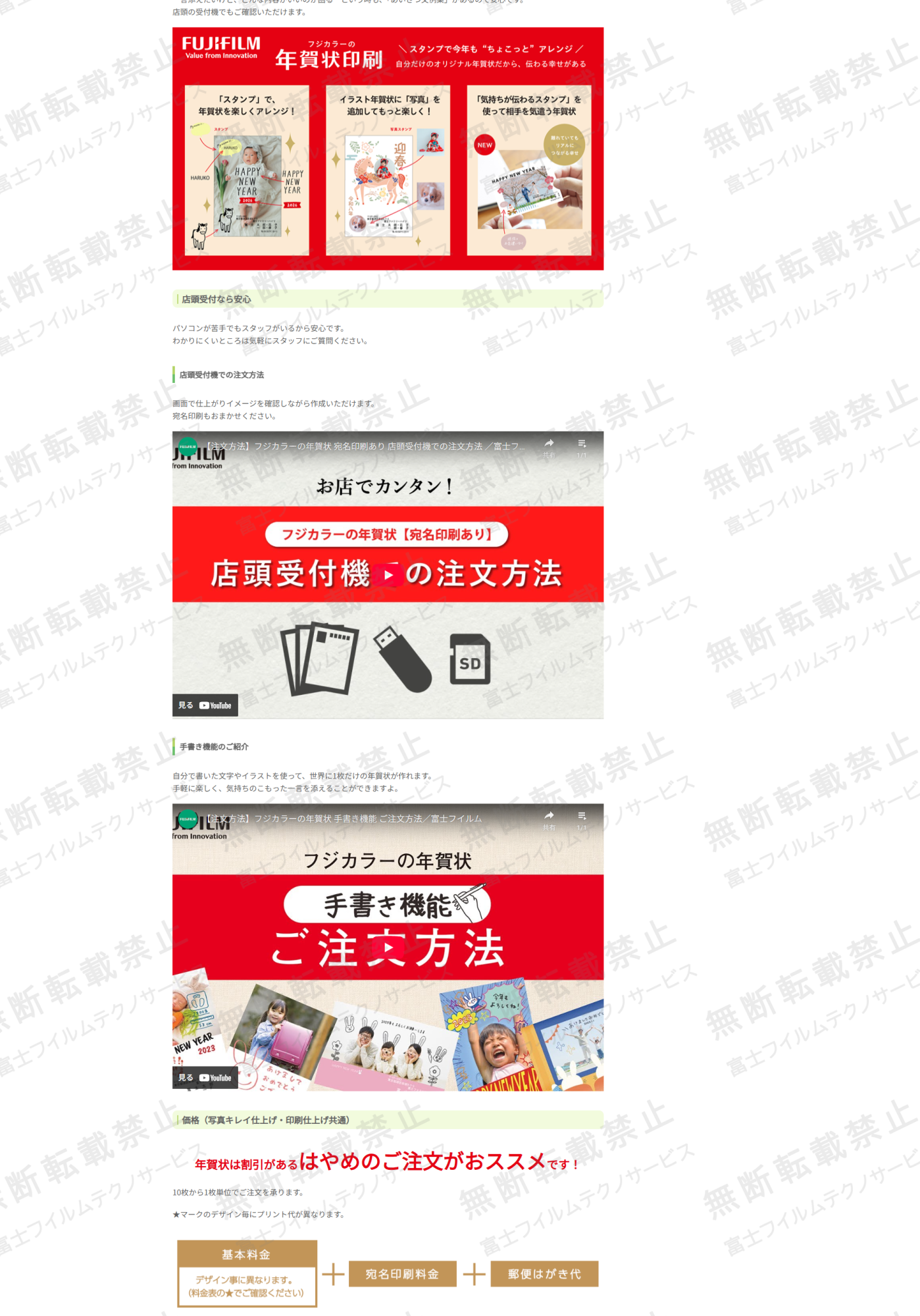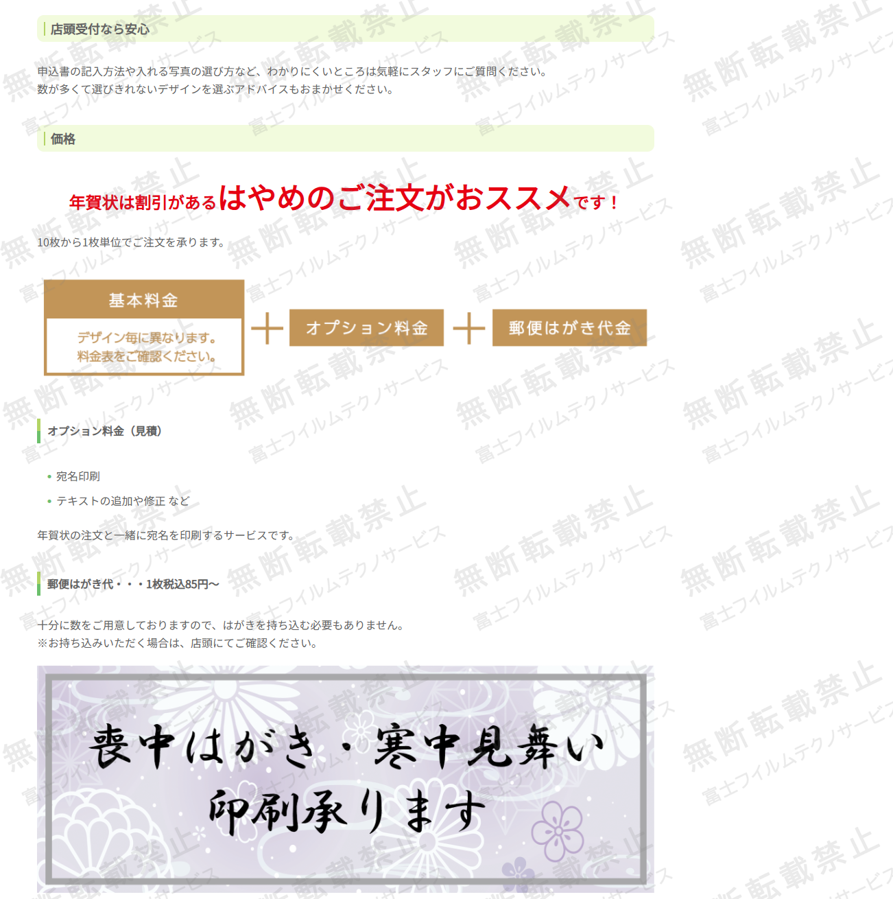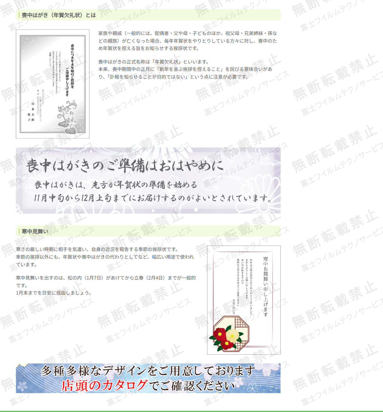 富士フイルムデザインのサンプル画像および提供素材を多数使用して、1ページで年賀状と喪中はがき・寒中見舞いの訴求を行います。